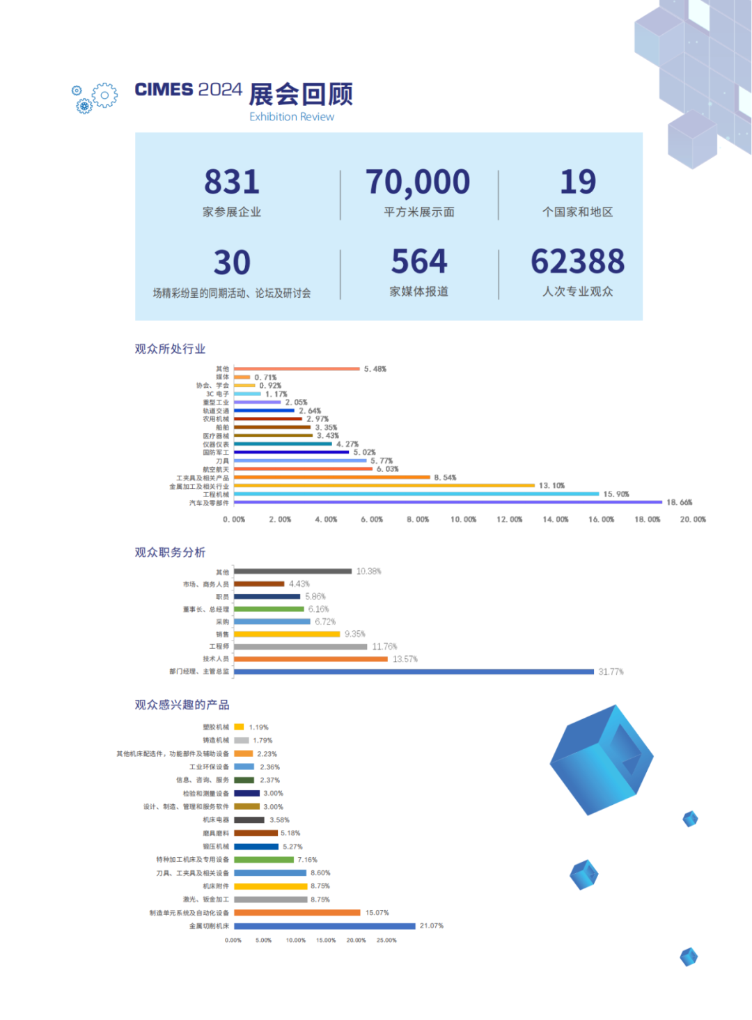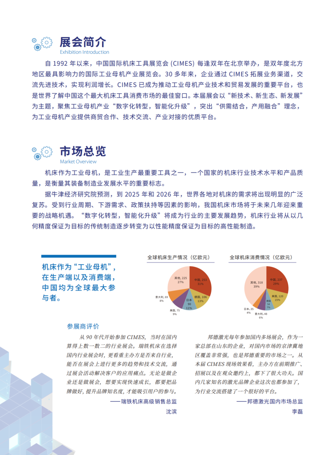 本届展会指导单位为中国机械工业联合会,主办方为中国机械工业集团有限公司、中国机械国际合作股份有限公司和中国机床总公司。预计展览面积10万平米,将吸引28个国家共计1000家企业参展,预计到场观众10万人,同期活动30场。